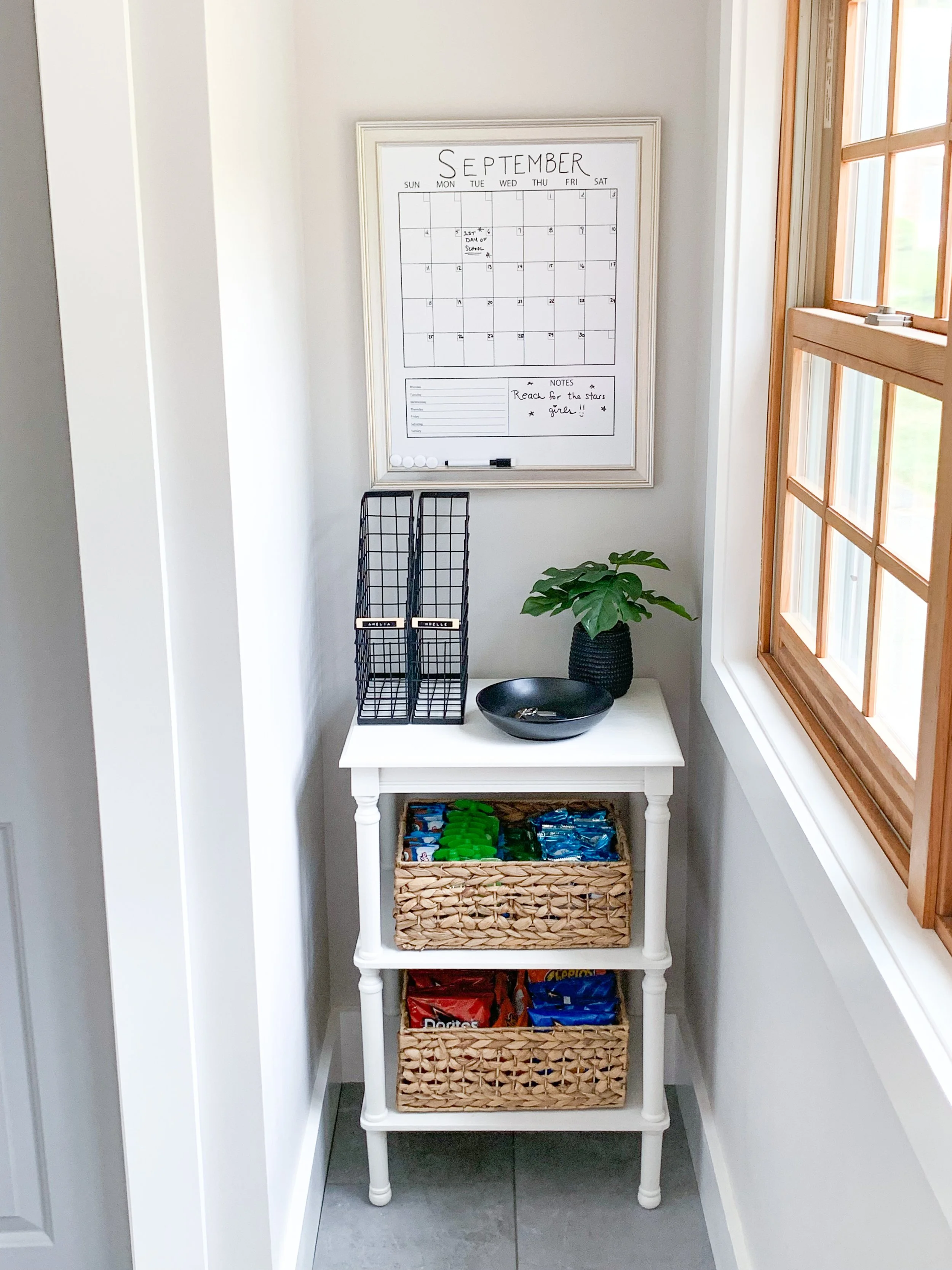 Like many others, my family is gearing up to head back to school after a fun summer off. During the summer, Tim finished our mud room and for most of it, I knew exactly how it should be organized. I knew I needed a long enough bench with at least three baskets for the girl’s shoes. We would need hooks for the girl’s jacket and book bags and of course I wanted it to all look as aesthetically pleasing as possible. These things were super easy to find and came together rather quickly however we had this little corner in the room that I had no clue what to do with. At first I thought the obvious solution would be storage for hats, scarves and gloves but then it came to me! It would make the most perfect little command center to help keep us school ready all year long!