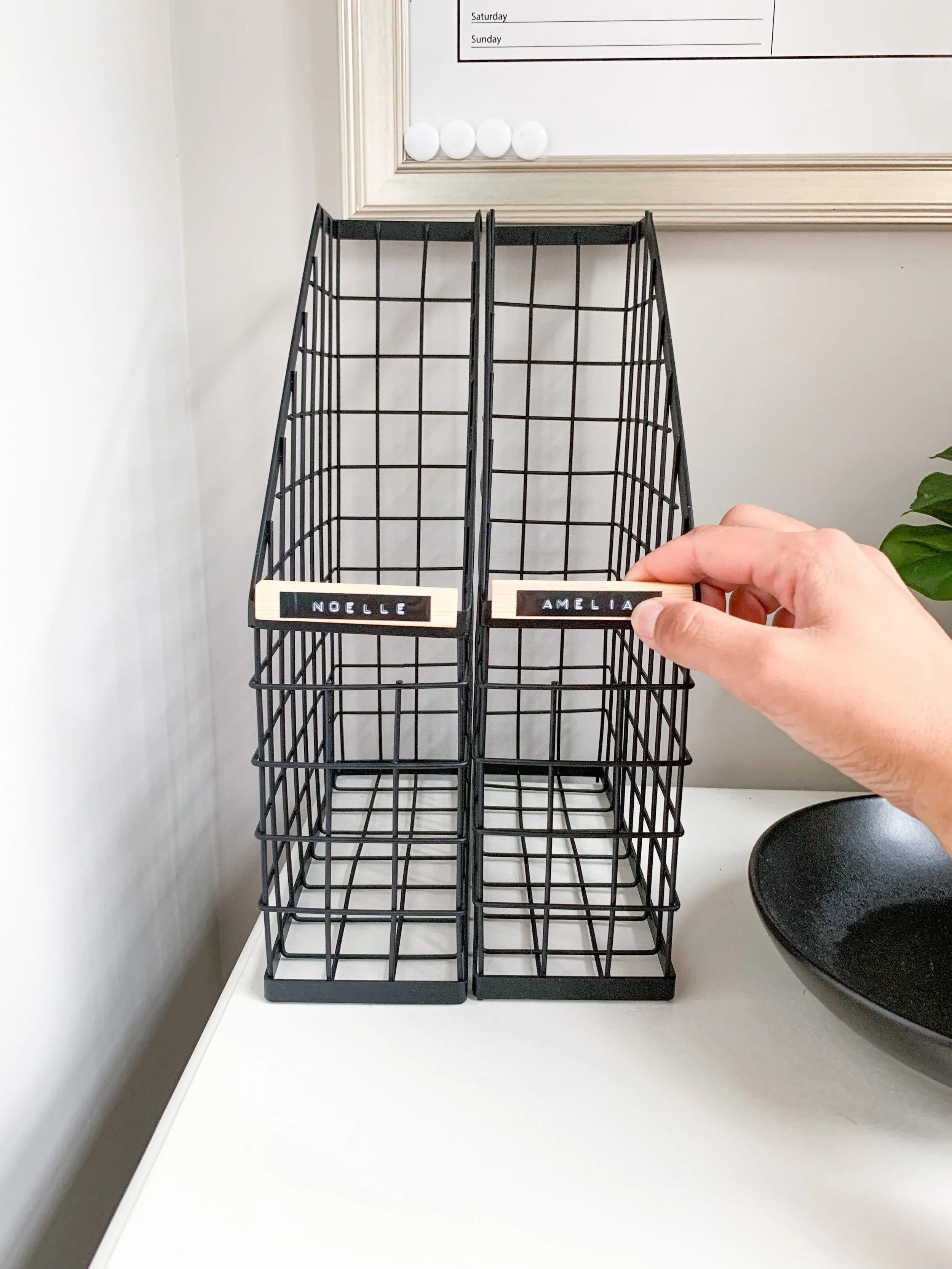 One thing most parents would know is that kids come home from school with a lot of paper. Sometimes with the shuffling of paper, important ones can get misplaced. I found two wire bins at Christmas Tree Shops and labeled them with each of the girl’s names. This way, when i have to send notes to their teacher, or send in permission slips, I can put them in the bins and remember to return them to school as the girls fly out the door in the morning.
