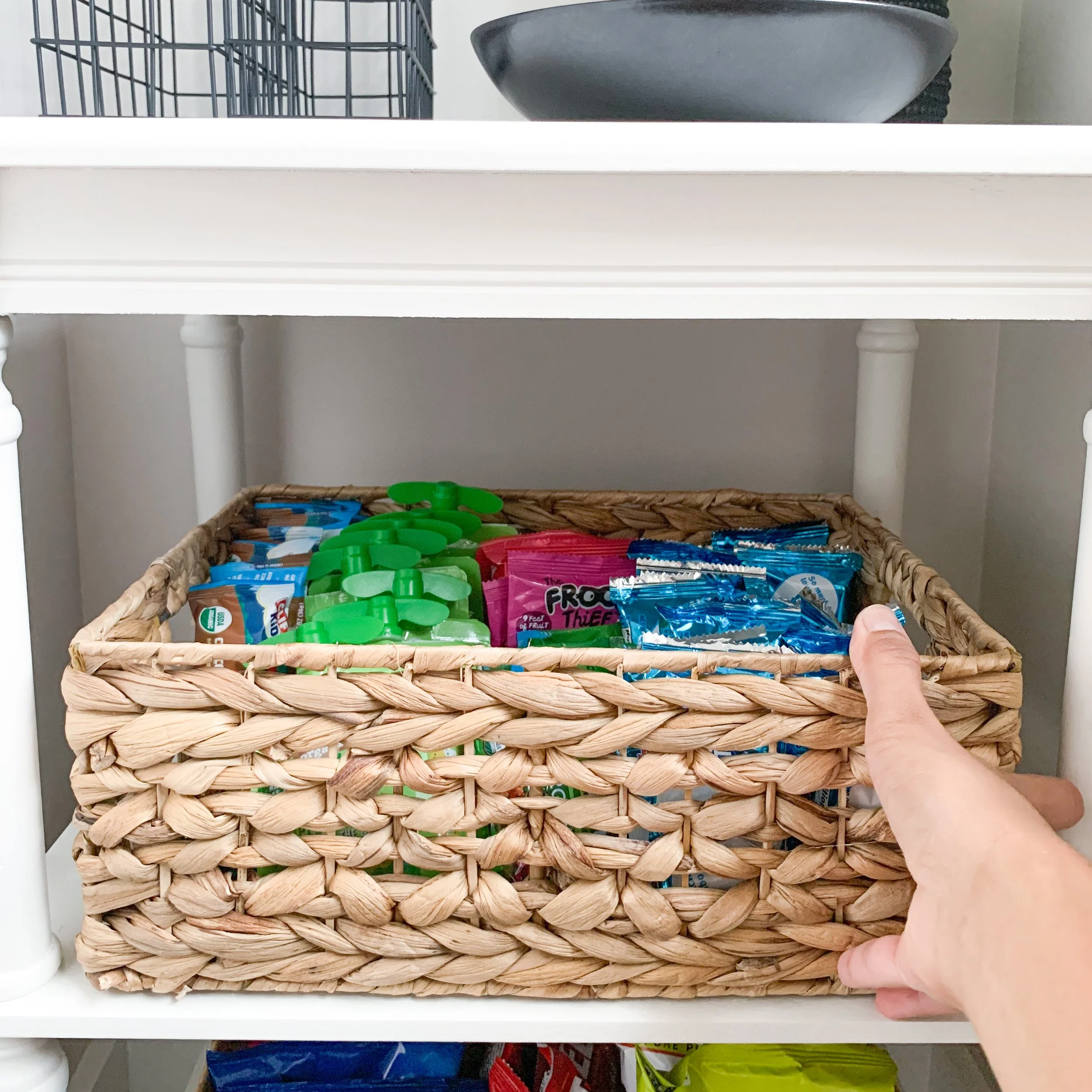 I had only 23” of space to work with for this corner so first I went straight to the furniture section of my Christmas Tree Shop. There were only a couple of styles that fit into this tight space so I chose the 3 tier bookshelf. I wanted something open that I could add baskets to and fill with those quick grab snacks for the girls as they run out the door. Right next to the furniture section were the the baskets and they had so many to choose from. I found the exact size and style that would fit the bookshelf perfectly.